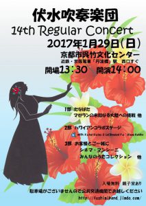 2017年1月29日(日)14時より、京都市呉竹文化センターにて、伏水吹奏楽団14th定期コンサートが開催されます。 第2部のハワイアンコラボステージにて、マリコ・レイイリマラニとクーハイハラウ京都校ダンサーが、吹奏楽団 […]